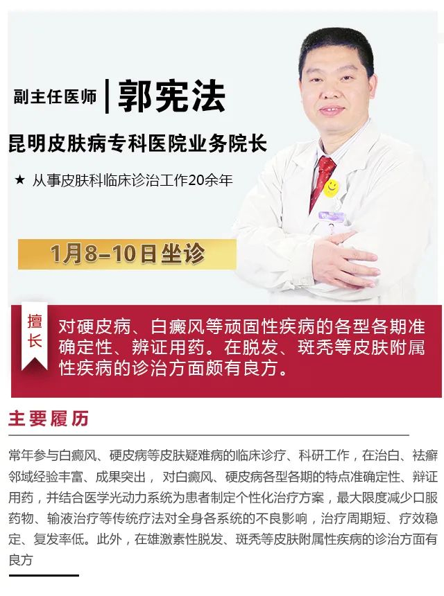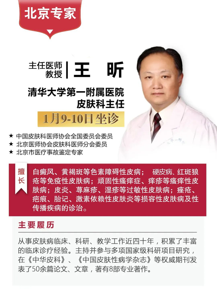进入冬季,斑秃、硬皮病、湿疹、荨麻疹等疑难、常见病出现加重和复发的情况,色斑、痤疮、白癜风等疾病进入“夏病冬治”的有利时节,即将迎来中国农历年,为了让广大皮肤患者能健康过好年,2021年1月专家门诊,昆明皮肤病专科医院再次请来了我们的“老朋友”——清华大学第一附属医院皮肤科主任王昕教授。
