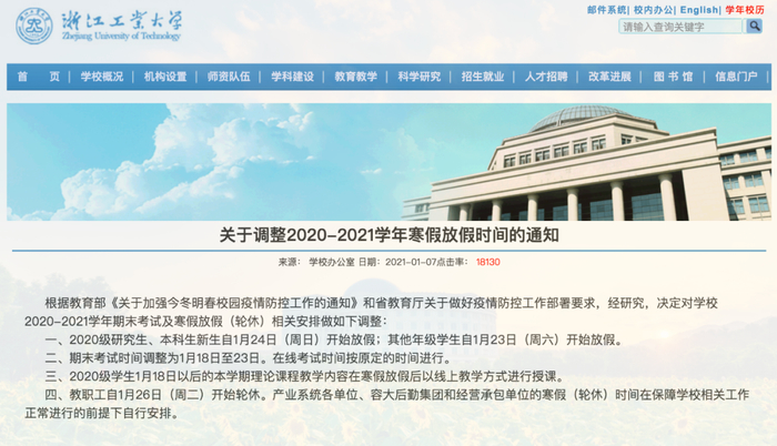 据钱江晚报消息,浙江工业大学原定学生寒假放假时间是在2月初,提前了一星期左右。