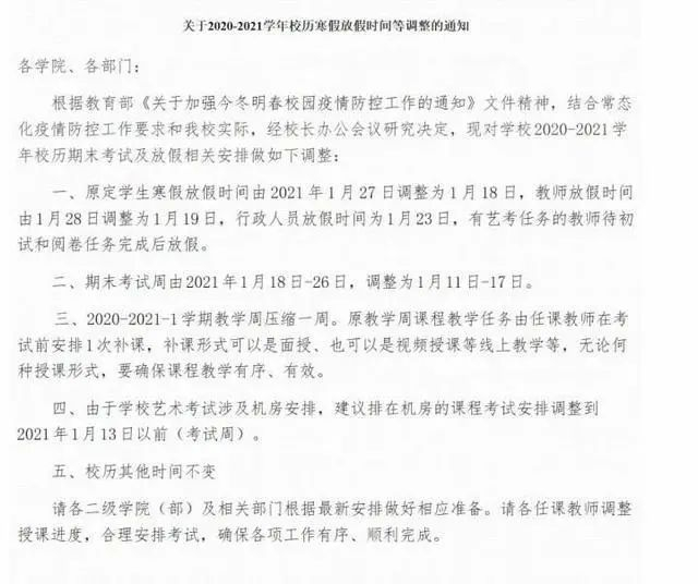 通知指出,取消元旦假期,调整寒假放假时间。2021年1月6日起开始放寒假,2021年2月23日寒假结束,共计放假49天,2021年3月1日正式上课。