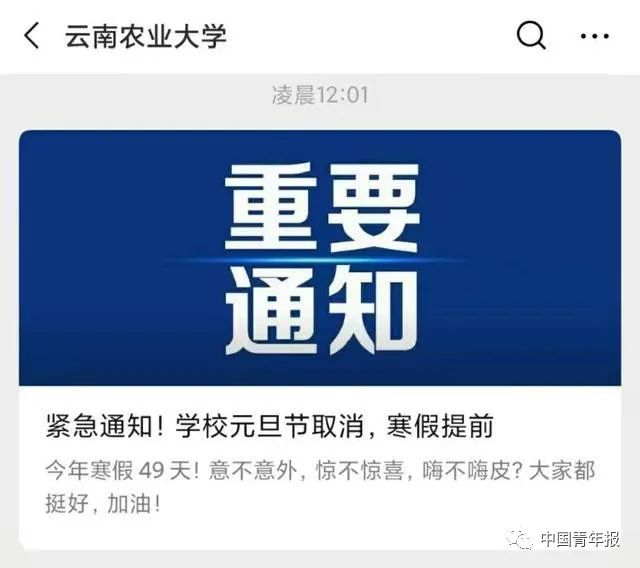 2020年12月27日,云南农业大学发紧急通知,调整2021年元旦节放假时间和2021年寒假放假时间。