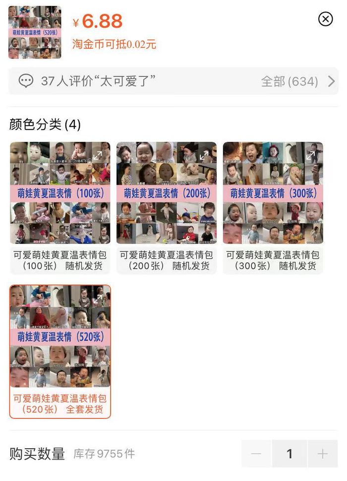 而在电商平台检索,有各种“萌娃”表情包在售,价格不一。某个韩国童星的表情包已成为打包售卖的商品,100张卖1.49元,而第四档的套餐足足有520张,标价为6.88元。该店铺同时有多套表情包在售,月销件数最高100+。