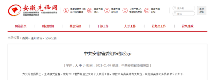 中共安徽省委组织部公示