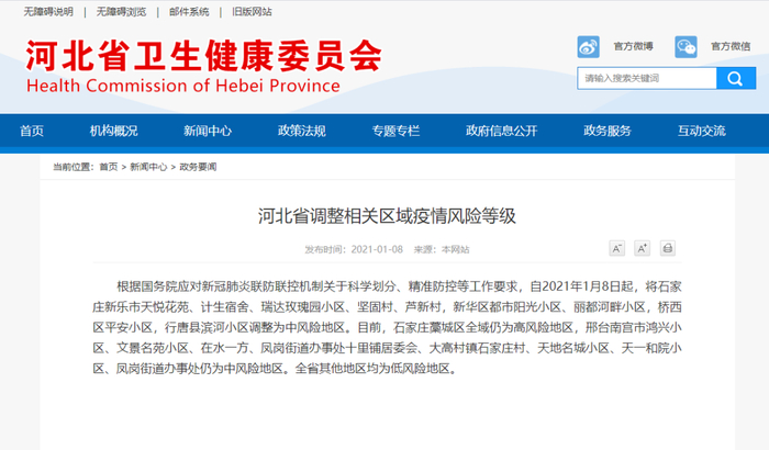 河北省卫健委消息,根据国务院应对新冠肺炎联防联控机制关于科学划分、精准防控等工作要求,自2021年1月8日起,将石家庄新乐市天悦花苑、计生宿舍、瑞达玫瑰园小区、坚固村、芦新村,新华区都市阳光小区、丽都河畔小区,桥西区平安小区,行唐县滨河小区调整为中风险地区。目前,石家庄藁城区全域仍为高风险地区,邢台南宫市鸿兴小区、文景名苑小区、在水一方、凤岗街道办事处十里铺居委会、大高村镇石家庄村、天地名城小区、天一和院小区、凤岗街道办事处仍为中风险地区。全省其他地区均为低风险地区。
