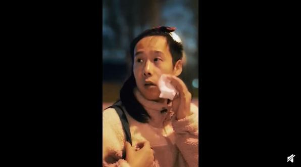 广告中,一个女孩独自走夜路时被黑衣男子尾随。女孩发现后神情慌张,皱眉思索如何脱身。突然,她停下脚步,从包里拿出一盒卸妆湿巾。