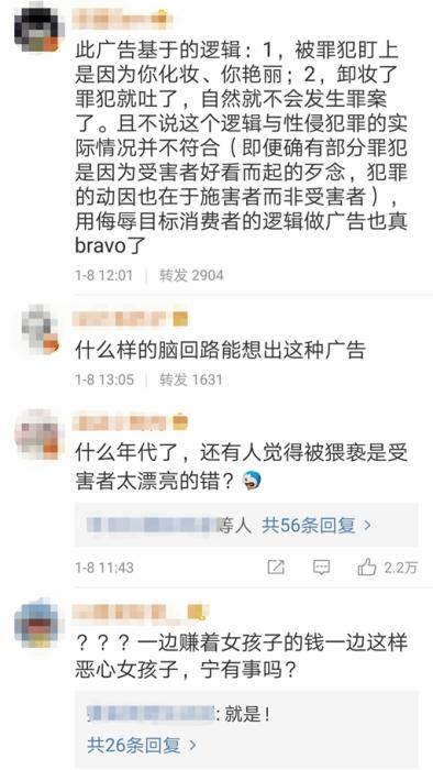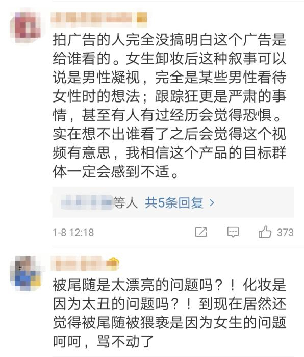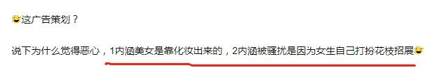 由于实在槽多无口,该广告随即在网上引发热议。有网友分析,这则广告看似宣传产品,实则内涵了两个刻板印象:其一内涵美女都是化妆化出来的,卸妆前后差异大;其二内涵女生被骚扰是因为她自己打扮得花枝招展。