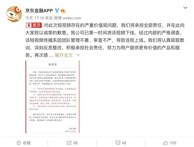 京东金融也发布致歉信,称该短视频传播系因团队管理不善、审查不严,导致违规上线。之后,京东发言人再次发表道歉声明,表示这次事件不仅仅是管理审核的问题,更是操作团队的导向、文化和价值观出了问题,公司已成立专门调查小组调查此事。