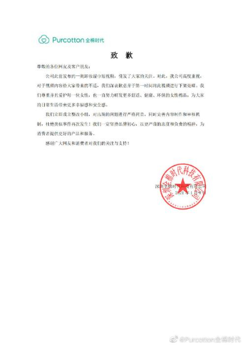 随后,全棉时代官方微博回应,称视频为广告创意,是为了突出商品的清洁功能,目前已经将此视频下架,对此深感抱歉。