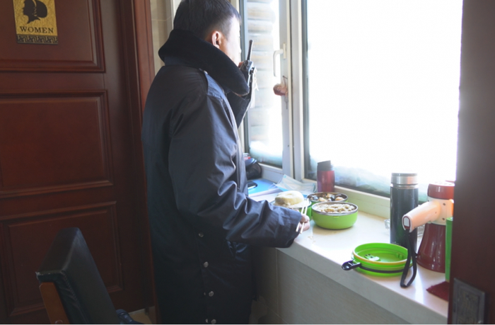 这里不仅是工作区也是生活区,为了方便游客出行,观光车队每天的工作时间是早7时至晚21时,24小时备勤,而车辆的调配更容不得半点空闲,王蕾从早到晚几乎都不会离开自己的岗位,中饭和晚饭都是由同事帮忙打回来,就在卫生间门口边工作边吃。“办公桌”后一米远的地方摆放着一张折叠床,是值夜班驾驶员的“寝室”,自2015年雪乡景区成立观光车队后,三个换乘站内的洗手间就成了他们的临时“办公室”和“寝室”。