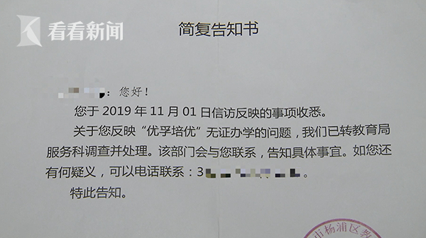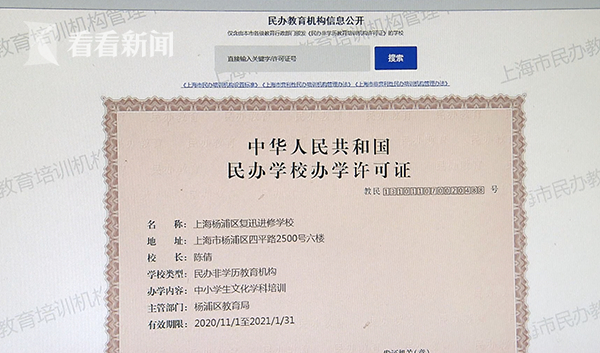 陆先生说,他早在2019年11月就发现,杨浦区一家注册为“优孚培优”的教育机构,企业名称为上海旋赛教育科技有限公司,但经营范围内,不包括面向中小学生开展的学科类、语言类文化教育培训,而且也没有查到其具有民办学校办学许可证。于是,当时就向杨浦区教育主管部门反映,对方也严肃立案查处过,并给予反馈。