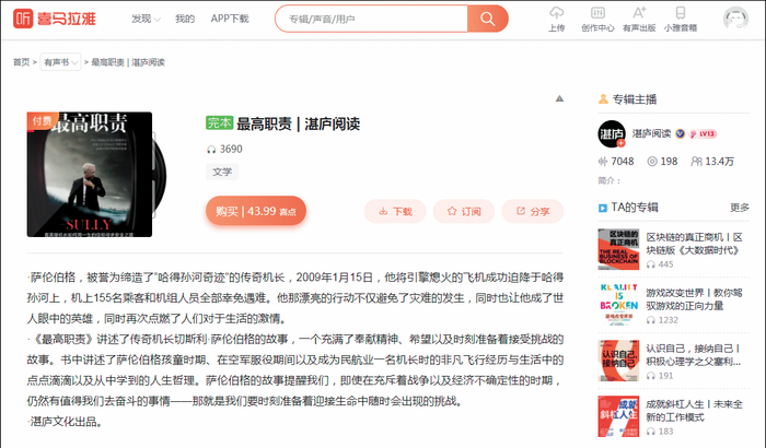 “我们很多的有声书是专门找适合的人来朗诵。”陈晓晖说。湛庐文化出过一本《最高职责》,作者是创下“哈得孙河奇迹”的传奇机长切斯利·萨伦伯格。趁着电影《萨利机长》热映的东风,《最高职责》也被制成有声书。为了契合作者的飞行员身份,当时湛庐邀请来的朗读者是有20年飞机经验的南航机长姚永强。“硬汉”姚永强在一篇文章中说,真正走近书中内容后,他在录音时流泪了,“反反复复诵读萨伦伯格机长的内心自白,慢慢对于何为职业飞行员有了更深的理解”。