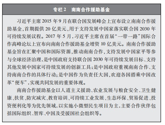 ——南南合作援助基金。截至2019年底,中国与联合国开发计划署、世界粮食计划署、世界卫生组织、联合国儿童基金会、联合国人口基金、联合国难民署、国际移民组织、国际红十字会等14个国际组织实施项目82个,涉及农业发展与粮食安全、减贫、妇幼健康、卫生响应、教育培训、灾后重建、移民和难民保护、促贸援助等领域。