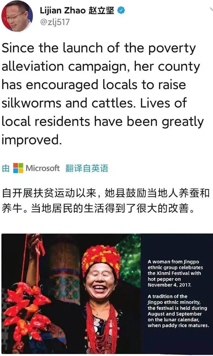 推文还附上了景颇族妇女群众身着喜庆的民族服饰,手提象征着红红火火好日子的红辣椒,喜笑颜开的庆祝新米节的图片。值得一提的是,这张图片还登上过在联合国总部举行的“追寻美好生活”中国脱贫成就展。