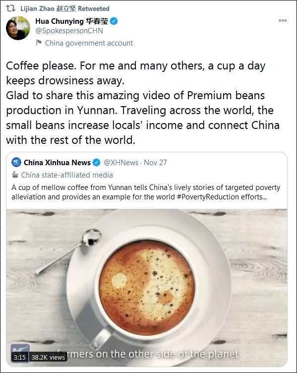 12月1日,中国外交部发言人华春莹转发了一条关于云南咖啡的短片:“很高兴能够分享这条精心制作的视频,介绍了云南精品咖啡豆给世界。小小的咖啡豆环游世界,提升了当地人的收入,也将中国和世界各地紧密相连。”