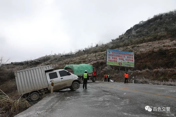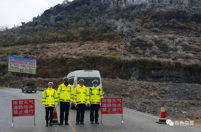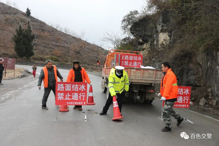 2021年1月7日至8日,因受雨雪天气影响,百色市乐业县境内多条道路出现结冰情况,为确保辖区道路交通安全,乐业县公安局交警大队全员出动,上路巡逻排查隐患;在道路结冰路段及时封闭道路,执勤人员坚守在各结冰道路路面,引导车辆绕行。