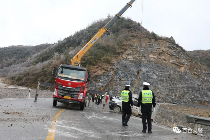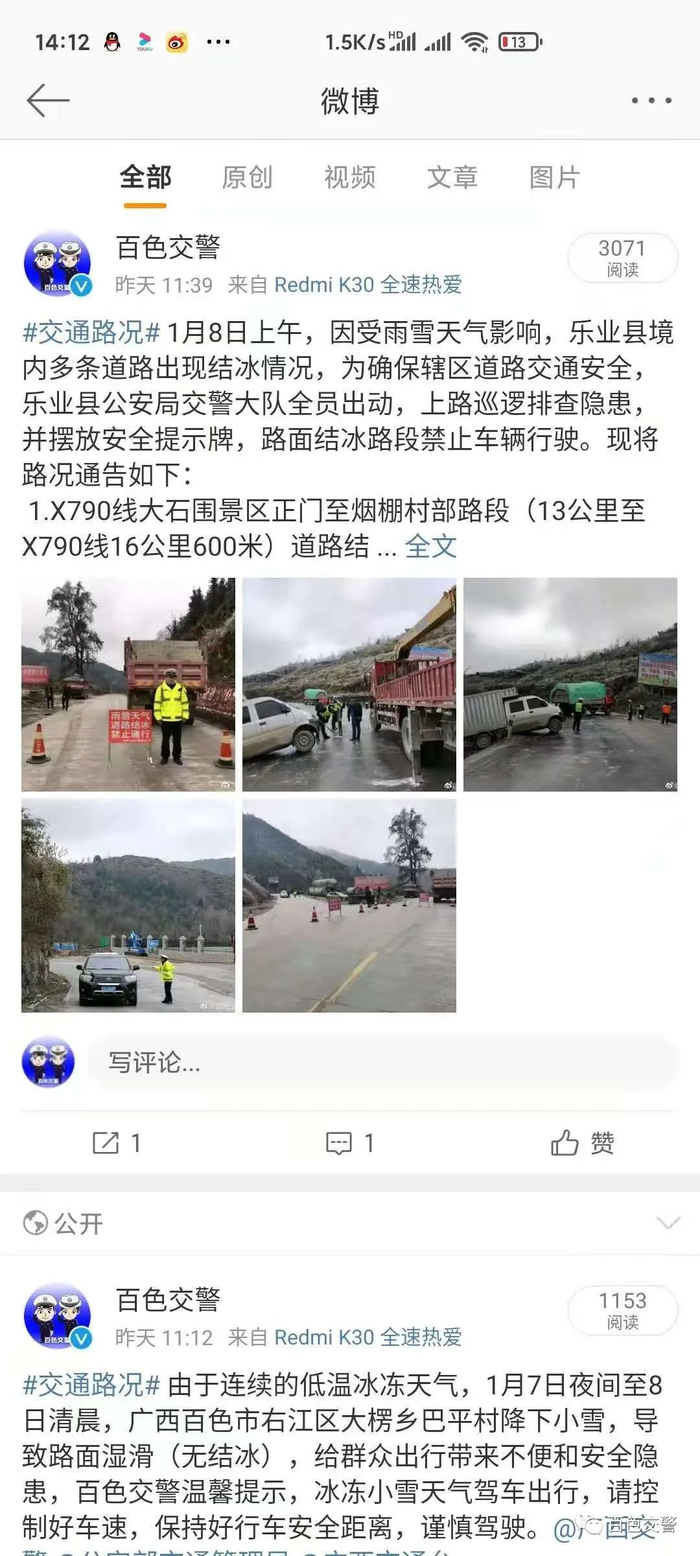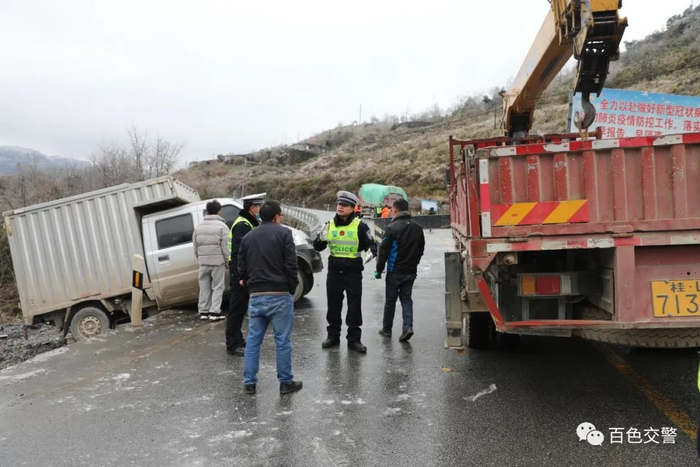 2021年1月8日上午,百色市乐业县大石围路段,一辆小货车因路面结冰滑出路面。交警一边联系吊车,一边疏导交通。望着交警忙碌的身影,和一张张被冻红的脸庞和耳朵,司机伸出了大拇指,被这一幕幕暖人的风景感动。