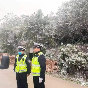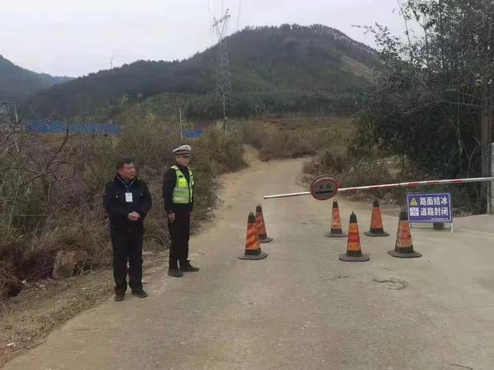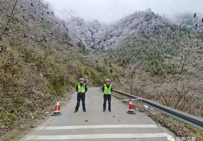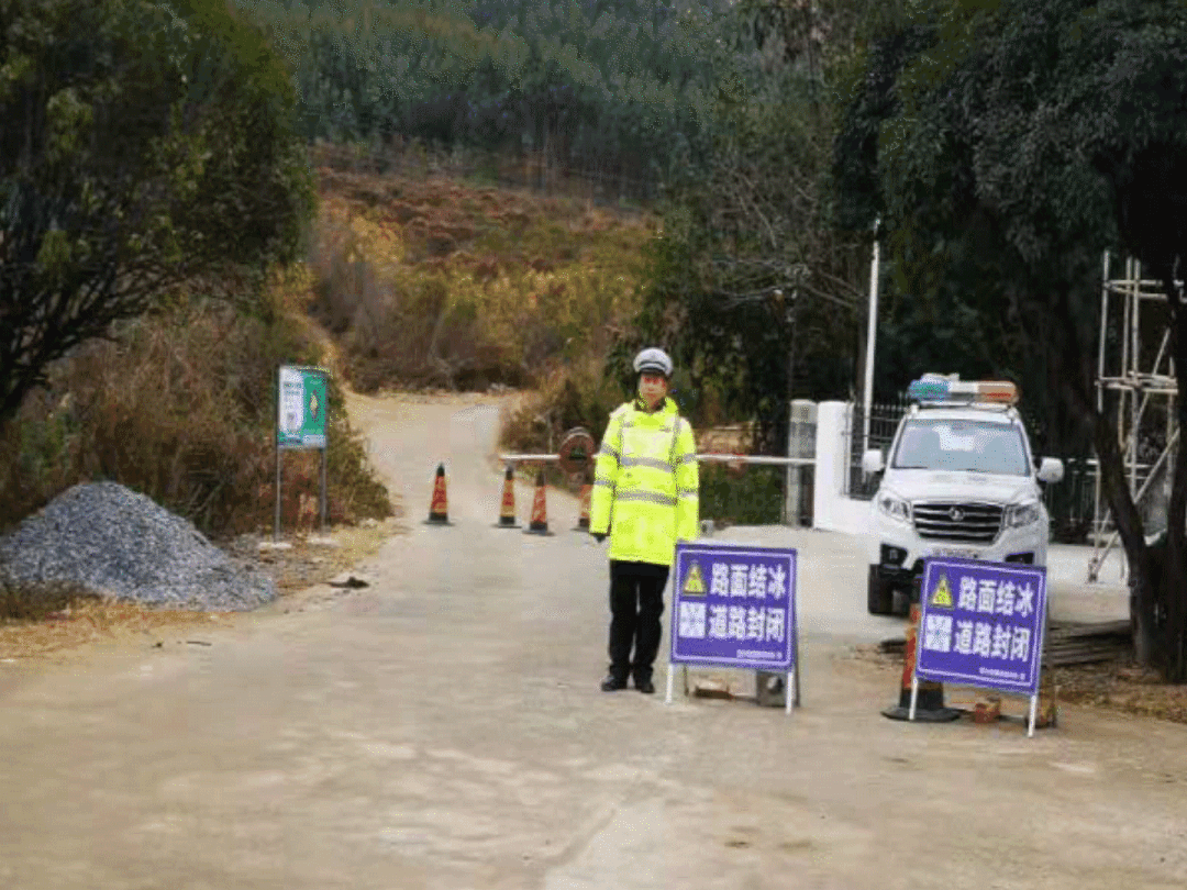 ▲贺州市公安局交警支队三大队辖区部分景区路段有轻微结冰现象,大队联合当地政府、区交通局到卡口值守,进行交通管制,劝离观冰群众。