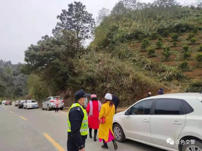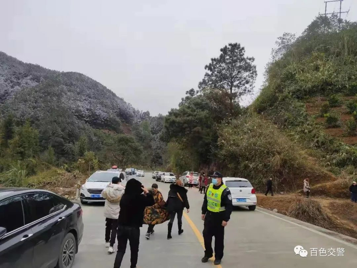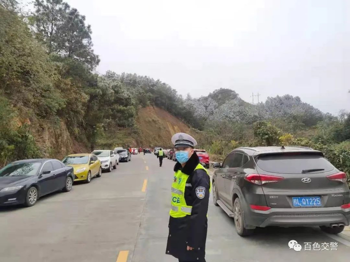 2021年1月9日,百色市右江区323国道百色至泮水路段,龙细村至巴平村路段沿途山顶结冰霜,群众纷纷在路边停车观看。为保障道路通行安全,民警及时对在该路段上停车的群众进行劝离并指挥车辆通行。