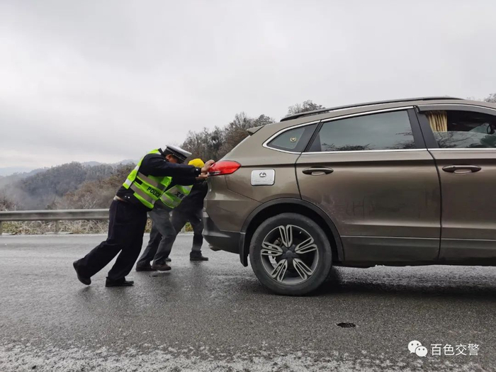 2021年1月8日,百色市乐业大石围景区正门烟棚村部路段,一车辆原地打滑,无法行驶。交警们不顾严寒,及时上前帮助司机推车上坡,司机看到交警的热心行为,感觉心里暖暖的。