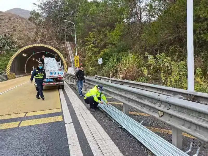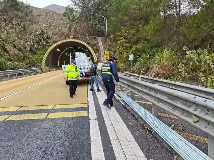 ▲贺州市公安局交警支队高一二大队民警面对严寒天气对路面巡查、排除隐患时刻不放松。2021年1月8日,民警在巡逻时,发现贺州市木冲隧道口有一捆钢管被洒落在车道上,具有很大的安全隐患,遂赶紧把其规整到路旁,并调查监控,最终锁定肇事车辆为一辆重型半挂牵引车,最后大队联合贺州路政大队对其在高速路洒落物品的违法行为做出了3000元的行政处罚。