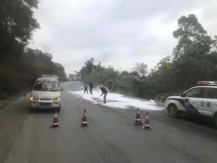 ▲贺州市公安局交警支队交警二大队民警对湿滑路段路面进行清扫处理,同时引导车辆有序通行
