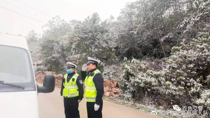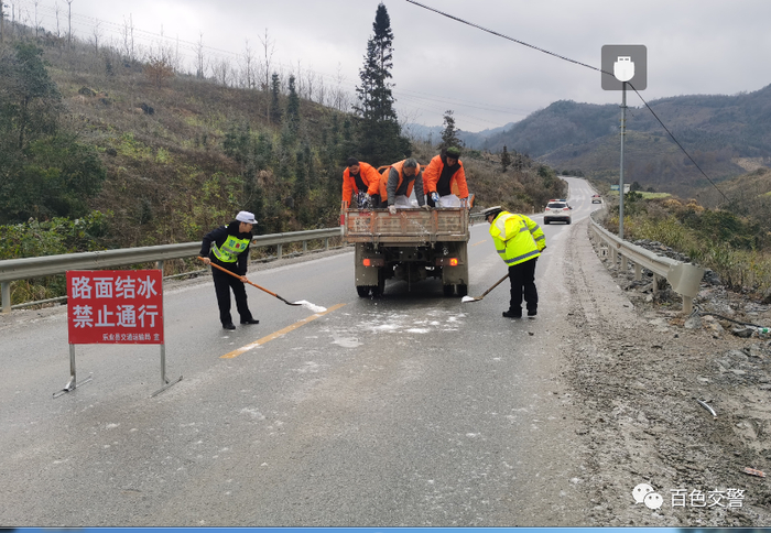 面对此次雨雪冰冻天气,百色交警部门加强应急预警、及时与相关部门联动联勤,在寒潮冰冻天气严重的各主干道路口、易结冰路段增派警力,24小时巡查路面结冰情况,指挥调度警力,进行重点路段重点管控,同时配合有关部门洒盐化冰作业,以确保第一时间将隐患排除,为群众出行排忧解难。
