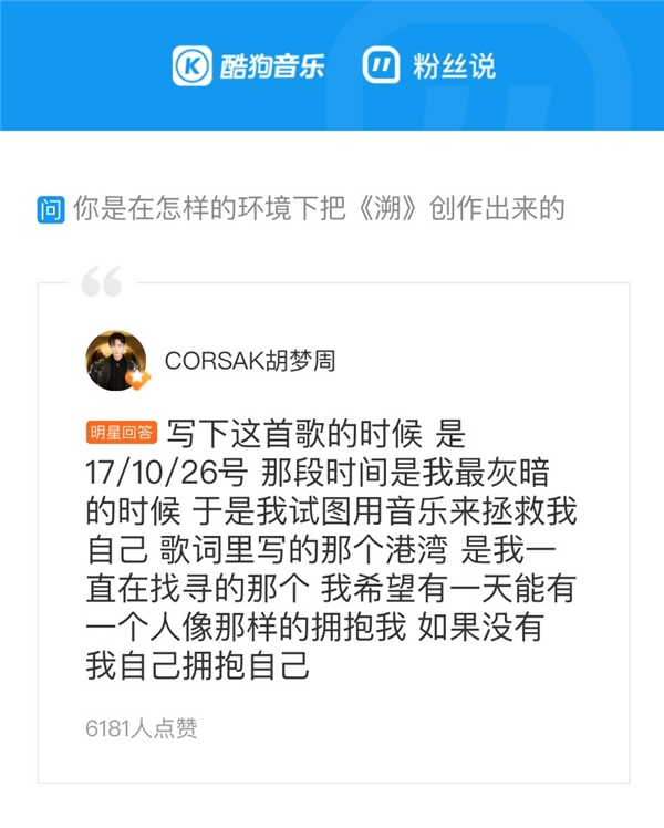 荣登最爱翻牌榜TOP 1的,则是新生代音乐人CORSAK胡梦周。舞台上高冷酷帅的CORSAK在酷狗音乐秒变话痨小胡,强势翻牌178次,堪称“宠粉小王子”。在粉丝说专页,CORSAK还和网友们分享了自己创作《溯》的幕后故事——原来这首年度热单竟然创作于他最灰暗的时刻,是他给予自己的“拥抱”,让人有点心疼。