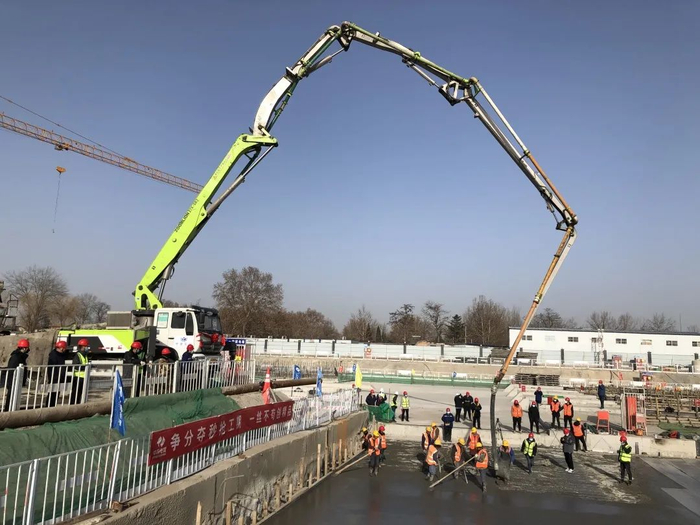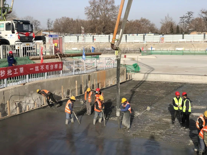 迎着冬日的暖阳,西安地铁建设的工友们紧张而有序地进行着草滩北站车站主体封顶工作,现场泵车轰鸣,两位工人合力扶着泵管,一边将混凝土打入顶板内,一边缓慢移动着,后续还有工友熟练地进行混凝土振捣和找平收面……不一会儿工夫,草滩北站车站主体的最后一块顶板就完成了浇筑。