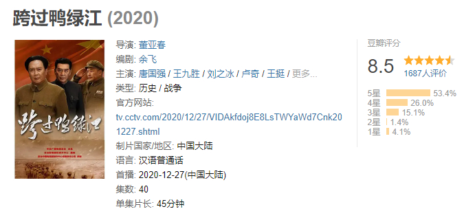 由中央广播电视总台出品,总台影视剧纪录片中心摄制,总台中国电视剧制作中心有限责任公司承制的重大革命历史题材剧《跨过鸭绿江》,正在央视一套热播。