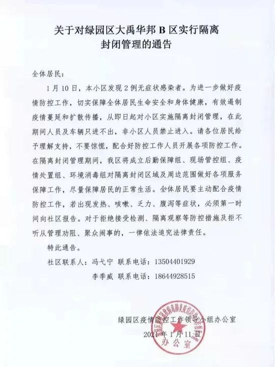 1月11日,绿园区疫情防控领导小组办公室发布了《关于对绿园区大禹华邦B区实行隔离封闭管理的通告》和《关于对绿园区芙蓉壹号C区实行隔离封闭管理的通告》。