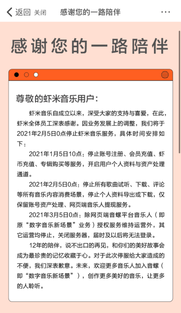 有人说,虾米音乐关停,意味着阿里集团战略性放弃在线音乐市场的布局,整个中国在线音乐行业的发展将进入一个新的阶段。回顾虾米音乐的发展史,的确令人唏嘘。2008年,虾米音乐正式上线,凭借简洁的操作页面、超前的“社区+内容”模式,火速风靡全国,各项数据一度跃居行业TOP 1,成为不少音乐用户的“白月光”。然而在被阿里巴巴集团收购后,虾米音乐却在随之而起的互联网音乐付费大战中错失最佳时机,无奈陨落。