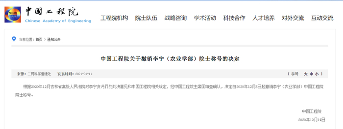 1月11日,中国工程院官网公布关于自2020年12月8日起撤销李宁(农业学部)院士称号的决定。