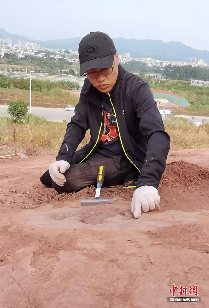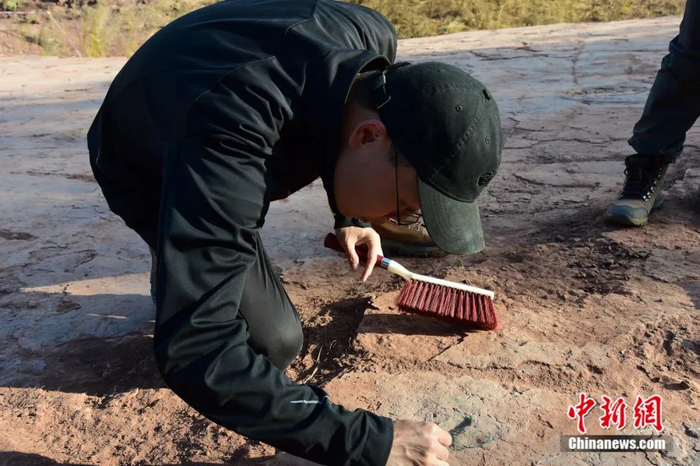 邢立达向中新社记者回顾恐龙足迹群时仍难掩激动。2020年11月7日上午,考察队在上杭县周遭的红层踏勘,没有发现有价值的线索。下午,考察队的两位领队,钮科程和邢立达商议,队员们上午都比较疲劳,不如下午就在上杭县附近的工地寻找一些露头,看看岩性。