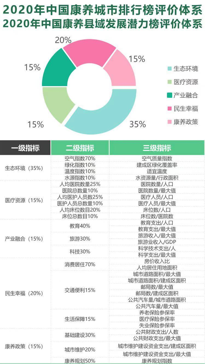 中国康养城市(含县域发展潜力)评价体系由5个一级指标,16个二级指标,32个三级指标组成。数据来源主要来自国家统计局、各地方政府统计公报(2020)、《中国城市统计年鉴2019》以及其它公开资料。一座城市是否康养与它的生态环境、医疗资源、民生幸福、产业融合以及康养政策息息相关。
