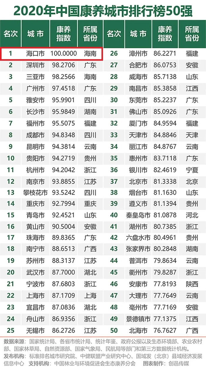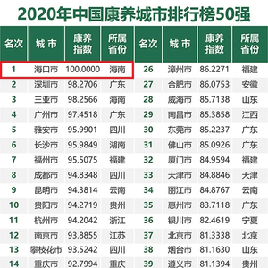 原标题:2020年中国康养城市排行榜发布,海口首夺第一!