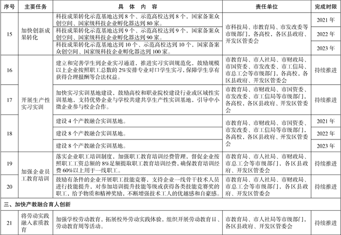 建立和完善学生到企业实习通道,推进实习实训规范化,鼓励规模以上企业按照职工总数的2%安排专业对口学生实习,保障学生享有获得合理报酬等合法权益。加快实习实训基地建设,鼓励高校和职业院校建设行业或区域性实训基地,支持优势企业与学校共建共享生产性实训基地,引导中小微企业参与校企合作。到2023年,建成20个高质量专业化产教融合实训基地。