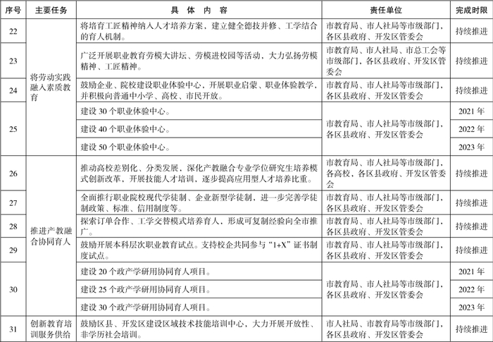 推进产教融合协同育人。全面推行职业院校现代学徒制、企业新型学徒制,进一步完善学徒制政策、标准、信用制度等。探索订单合作、工学交替模式培养育人,形成可复制经验向全市推广。鼓励开展本科层次职业教育试点。支持校企共同参与“1+X”证书制度试点。