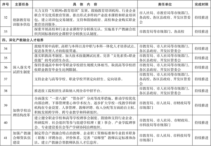 深入落实考试招生制度。鼓励开展中高职、高职与本科以及中职与本科一体化人才培养试点,促进各类型人才的衔接贯通。落实职教高考制度,保持普通高中和中等职业学校招生规模大体相当,取消高等学校招收职业教育毕业生比例限制。支持企业与高等学校、职业学校开展定向招生、定向培养。推进技工院校招生录取纳入到全市中招平台。