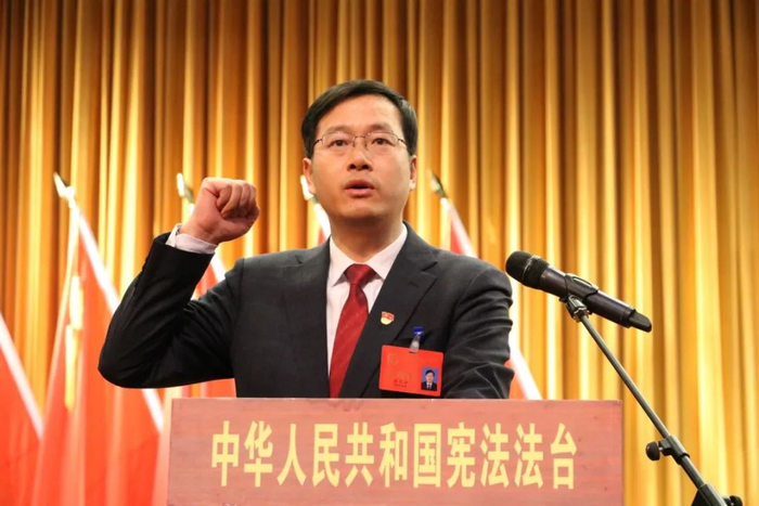 新当选的庐江县人民政府县长周天斌向宪法宣誓
