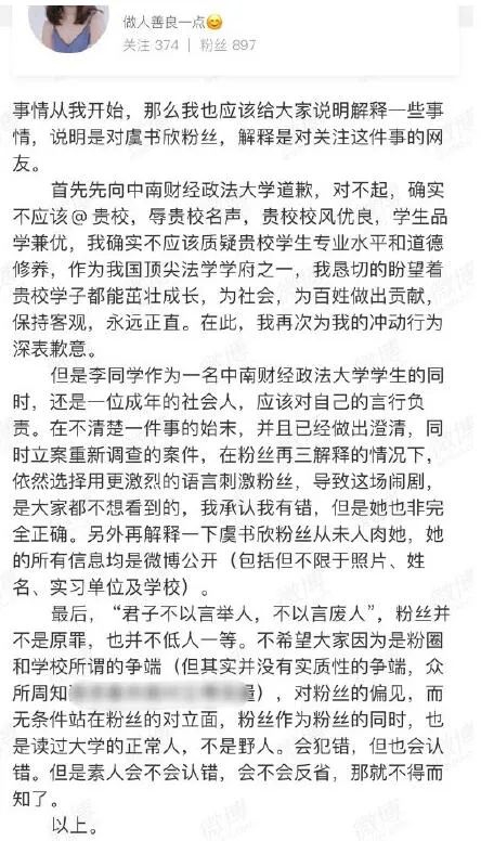 虞书欣粉丝:向中南财经政法大学道歉 中国搜索注意到,1月13日,有自称虞书欣粉丝的网友在其个人微博上对此前行为表示歉意。