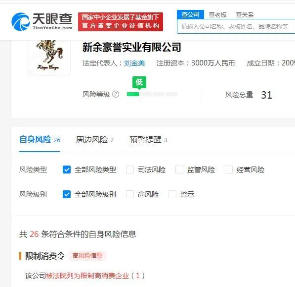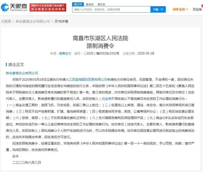 据中国搜索在天眼查查询发现,新余豪誉实业有限公司及其法定代表人刘金美(虞书欣的母亲),于2020年5月收到南昌市东湖区人民法院的限制消费令,根据网络上的信息显示,该公司因为没有偿还2220504元的债务,所以被法院判定限制高消费。截至1月13日,其母亲的公司仍被法院列为限制高消费企业。