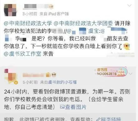 起因是,1月12日,有网友在其个人微博发文吐槽虞书欣是“老赖之女”(此条微博0转赞评)。随后该网友被扒出是中南财经政法大学学生。于是,虞书欣粉丝蜂拥至该校官博下留言,要求学校给予她严肃处理,并开除她。并威胁该网友称“24小时内,要看到你微博顶置道歉,为期一年。否则你们学校教务处会收到我的电话。”还有粉丝找到了该名网友实习的律师事务所,要求辞退她。