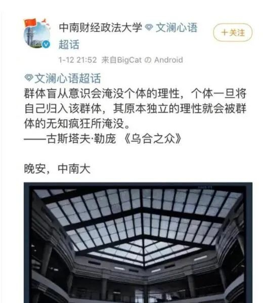 随后,中南财经政法大学在其官方微博发布一段耐人寻味的话∶《乌合之众》——群体盲从意识会淹没个体的理性,个体一旦将自己归入该群体,其原本独立的理性就会被群体的无知疯狂所淹没。值得注意的是:随后删除了这条微博。