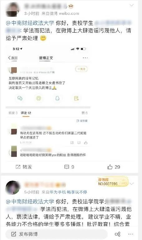 微博网友:中南财经政法大学那个学生说的话不是完全的造谣污蔑,即使是非常不妥的,也应该通过民事维权的方式进行。