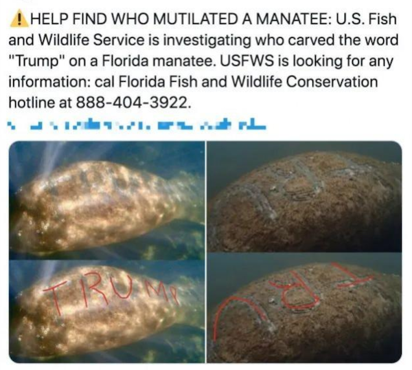 视频|太过分了!美国一头海牛背部被刻上“特朗普”