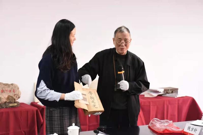 在赵国屏和多位亲属代表的见证下,赵国通代表家族向学校捐赠了赵祖康的交通大学毕业证书中文原件。张安胜为赵国通、赵国屏颁发捐赠证书,回赠了赵祖康在交大就读期间学籍档案的复制品。