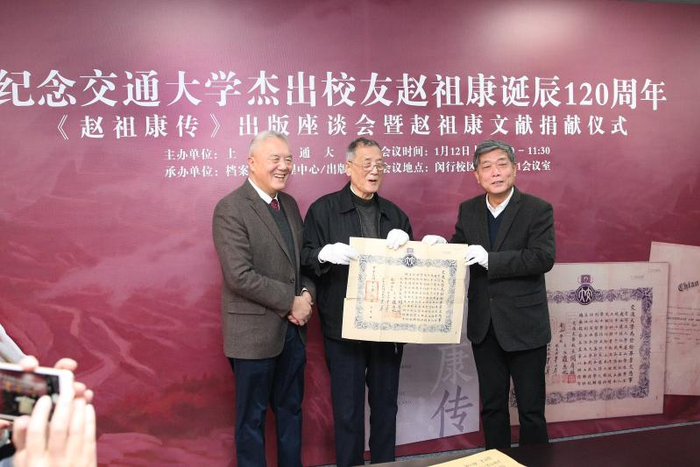 为纪念交通大学杰出校友、中国公路先驱赵祖康诞辰120周年,1月12日上午,《赵祖康传》出版座谈会暨赵祖康文献捐献仪式在上海交通大学闵行校区文博楼举行。此次活动由校档案文博管理中心和出版社联合举办,赵祖康之子、上海市政府参事赵国通、中国科学院院士赵国屏,《赵祖康传》作者、中共上海市委党校教授陶柏康等嘉宾,上海交大党委常委、副校长张安胜,原党委书记、校史编委会主任王宗光,校史编委会秘书长毛杏云,土木建筑工程系创系主任、教授黄金枝,以及上海交大相关单位负责人等近50人共同见证捐赠仪式。仪式由档案文博管理中心主任张凯主持。