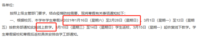 下学期开学:2021年3月1日开学。2021年3月1日-11日线上授课,12—14日各年级“错时错峰、分批分期”报到。