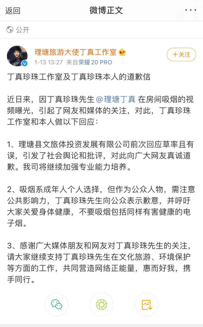 丁真珍珠工作室及丁真珍珠本人的道歉信