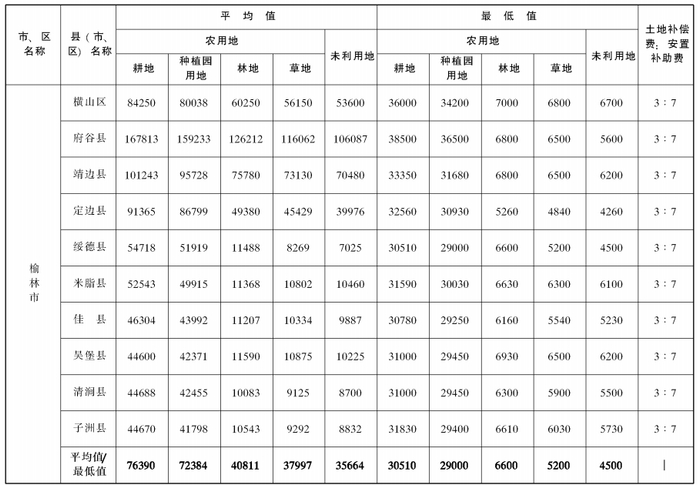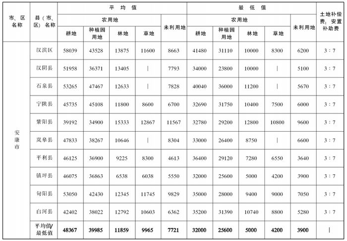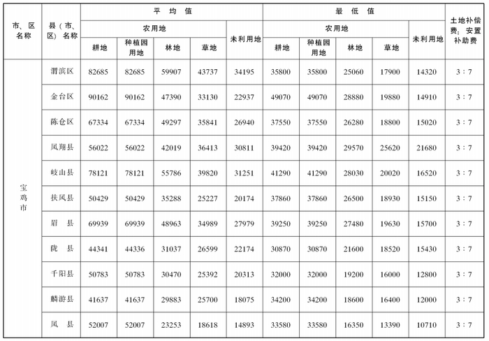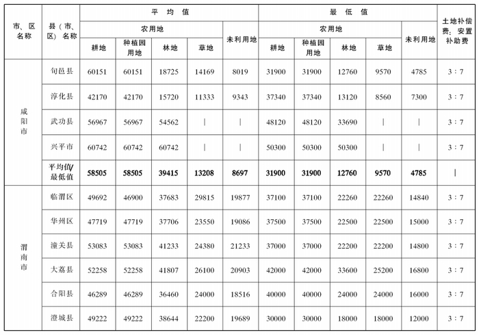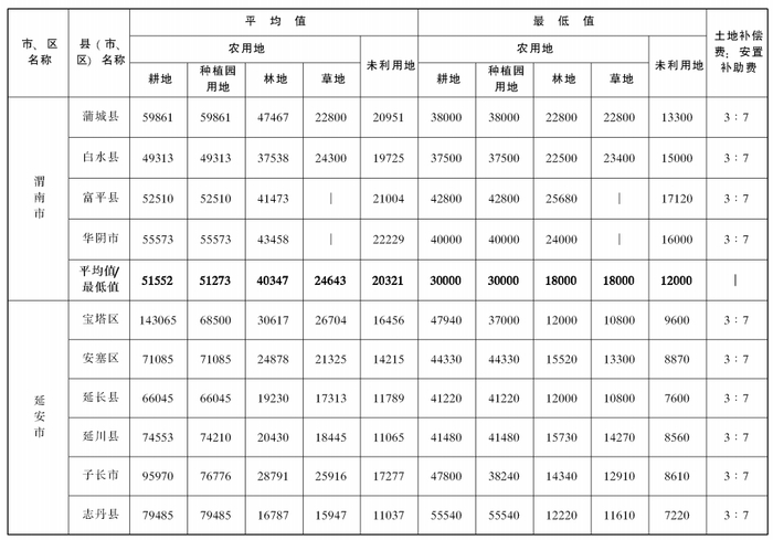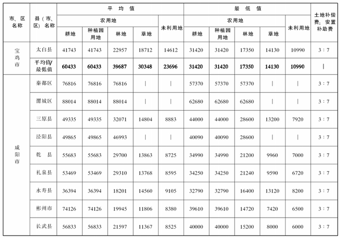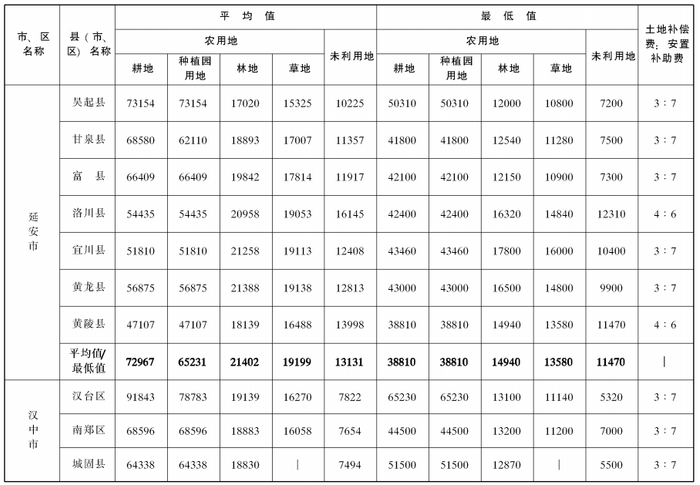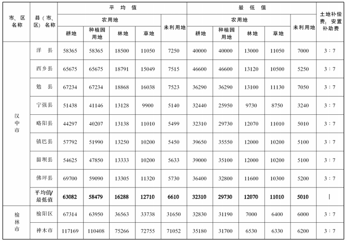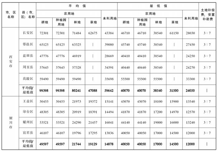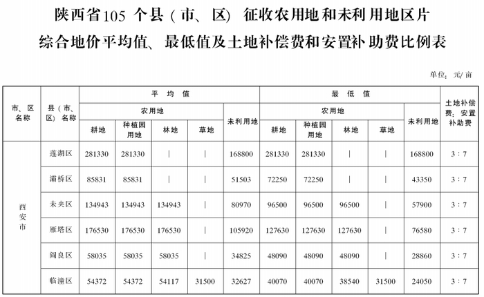 附件:陕西省105个县(市、区)征收农用地和未利用地区片综合地价平均值、最低值及土地补偿费和安置补助费比例表