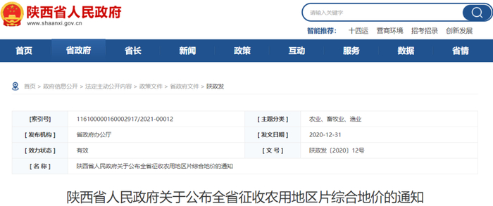 原标题:陕西省人民政府关于公布全省征收农用地区片综合地价的通知